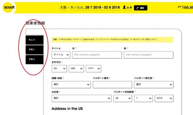 次の画面では、乗客全員分の個人情報を入力していく。画面の説明は日本語になっているが、書き込む名前はローマ字でパスポートと同じ表記で書こう。この情報を間違えていると人物不一致で乗せてくれなかったりする。なお、写真の左の赤枠で囲った部分をクリックすると各乗客を選択できるようになっているので、ちゃんと全員分の情報を間違いなく記入していこう。この画面で「パスポート」の情報も入力することになる。名前の前のタイトルというのは敬称のことで、男性なら「ミスター」、既婚女性なら「ミセス」、女性全般なら「ミズ」を選択。ただ、子供を選択した際はミスターのところが「マスター」とか誤植っぽい感じになっていたりする、、、こういうところのサイト作りの甘さはさすが海外、といったところか。まぁ、予約した後に不安なことがあったら、スクートの日本支店に電話 してみるのもアリだろう。