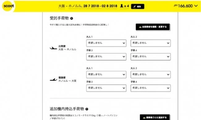 ボタンを押すと、各搭乗者に対して、荷物の選択ができるようになる。これで受託手荷物をカスタマイズできるようになるわけだ。1つ20kgまでの受託手荷物を往復購入した場合は7040円なので、荷物が減らせればそれだけ経費削減に繋がる。また受託手荷物の他にも、その下に機内持ち込み荷物の追加項目もある。このスクートでは機内持ち込みは1人メインバッグ(規格は最大サイズ:54cm x 38cm x 23cmまで)とサブバッグ(PCバッグなど小さいバッグ)で合計10kgまでとされているが、追加手荷物枠を購入するともう一つ手荷物最大7kgまでを持ち込み可能となり、結果、最大17kgまで機内持ち込みが可能となったりもする。これは荷物の多い赤ちゃん連れの家族にはありがたい枠だが、料金は受託手荷物と同じだけ掛かってくる(1往復で7040円)。