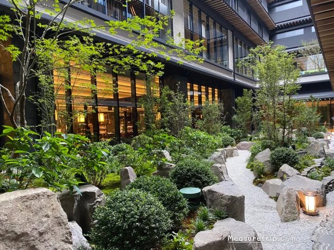 デュシタニ館内ツアーの始まりは、ホテルB1Fの中庭の日本庭園からスタートします。鈍く光るゴールド枠のガラス扉の向こうには、京都らしい箱庭の庭園の風景。まさに「京都」ですね。