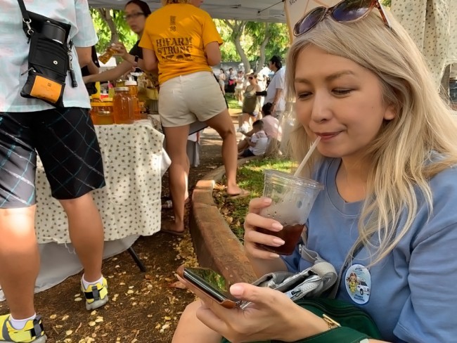 近くに売っていたハワイ島産のカウコーヒーを飲んで、ちょっと休憩しながらの一コマ。このKCCファーマーズマーケットは買ったものを食べるスペースは用意されておらず、こうして適当に縁石に座ったり、芝生の上に持参したマットを広げたりして食事をする、ほんとにお祭りのような感じで楽しむ朝市となっている。(少しだけテーブルセットが用意されている場所もあるけど、ごく一部のみ。)