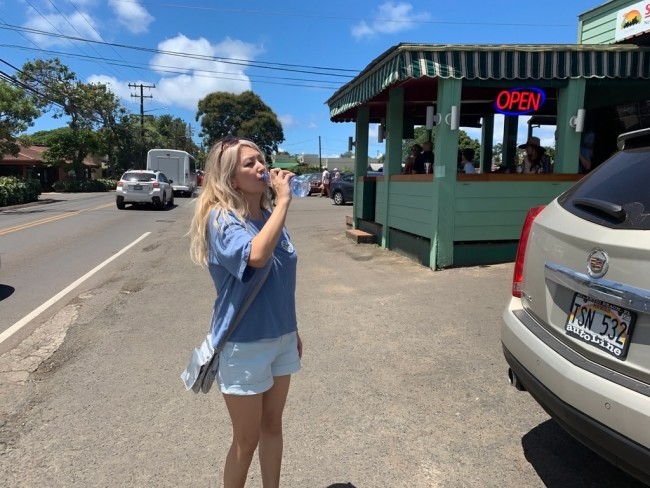 というわけで、前半のノースショア観光は、私達は動きやすい服装をチョイス。ミヅキは短パンにTシャツとミネラルウォーター2本を入れた保冷バッグ、私も近所のコンビニに出かけるようなTシャツ+短パンを着てツアーに参加。ウミガメが来るビーチにも寄る予定なので、靴は歩きやすく、水に濡れても大丈夫なサンダルスニーカーを履いている。