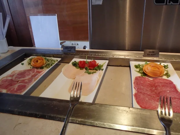 サラダの中に入れられるようにハムやパストラミなどが数種類用意されていた。横には一緒にまぶして食べられるようにカシューナッツやアーモンドなどのナッツ類やレーズン、マンゴーなどのドライフルーツも置かれている。