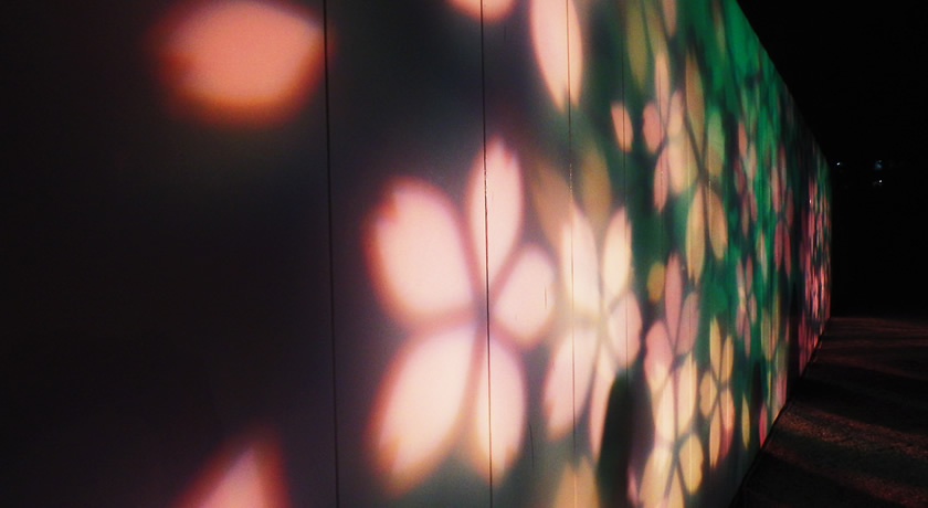 工事中ということで外壁はフェンスが張り巡らされているが、それをうまく利用してスクリーンに見立て、桜の花びらのライティングを施していた。このフェンス前で記念撮影をしている外国人観光客の姿も多かった。