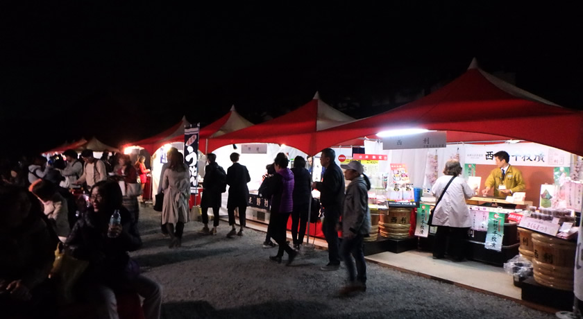 順路の出口付近には、休憩所や売店のテントが並んでおり、おみやげを買ったり、軽食(うどんなど)を食べることもできるようになっている。ここで休憩している人は多めだ。ちなみに来場者の顔ぶれだが、日本人はこの日は体感で2~3割り程度、欧米系2割、アジア系5割、そんな感じだった。様々な言語が入り乱れており、何だか住んでいる私らもどこか旅行に来たような気分になって面白かった。