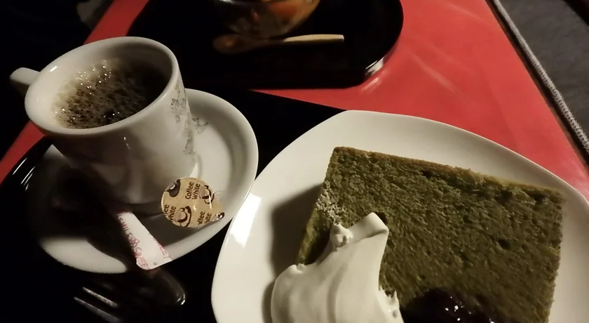 私(MORIO)はあんみつ(800円)、MIZUKIはコーヒーとシフォンケーキ(900円)を注文した。価格帯はかなり観光価格となっている。