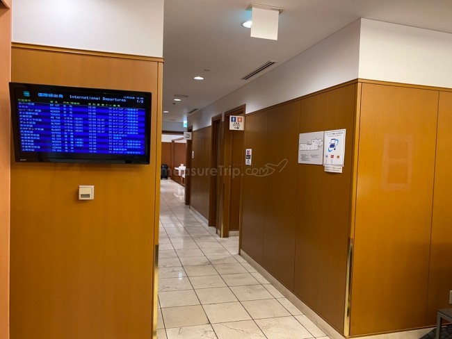 エントランスでラウンジ利用手続きを終えて中へと入る。エントランスすぐの場所には、フライトスケジュールモニター。またその奥には、トイレや喫煙ルームも用意されている。