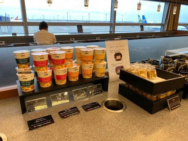 カップラーメンコーナーには、JAL特製のカップラーメンが4種類(そば、うどん、ラーメン、ちゃんぽん)。その隣にはフリーズドライのお味噌汁も用意されている。