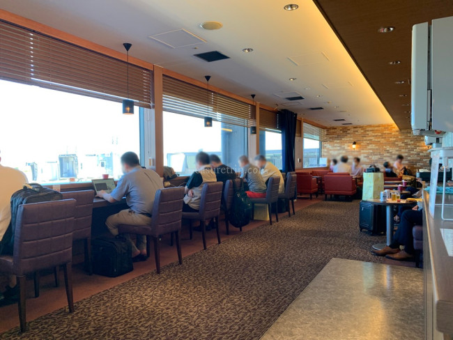 では早速カードラウンジ「アネックス六甲」の中に入っていこう。ラウンジ内の様子はこんな感じ。私達が利用したのは平日だったので、出張っぽいビジネスマンの利用者が多いような雰囲気だった。また、関西空港は国際線の発着はまだまだ少ない状況下であるにも関わらず、このエアサイドのカードラウンジはかなりの盛況ぶりだ。