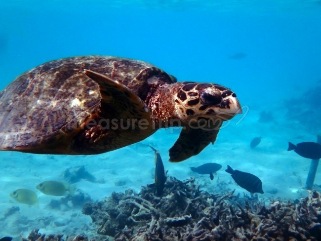 シュノーケルを始めて数分。運良くウミガメが目の前にやってくる!外はまだ晴れているので水中の透明度も申し分ない。Wモルディブのハウスリーフは、サンゴの多くは白化してしまっているが、ところどころで再生しているサンゴも居て、こうして魚影も濃く、ウミガメにも簡単に会える。ほんと、モルディブの海って雨季でも最高だな。