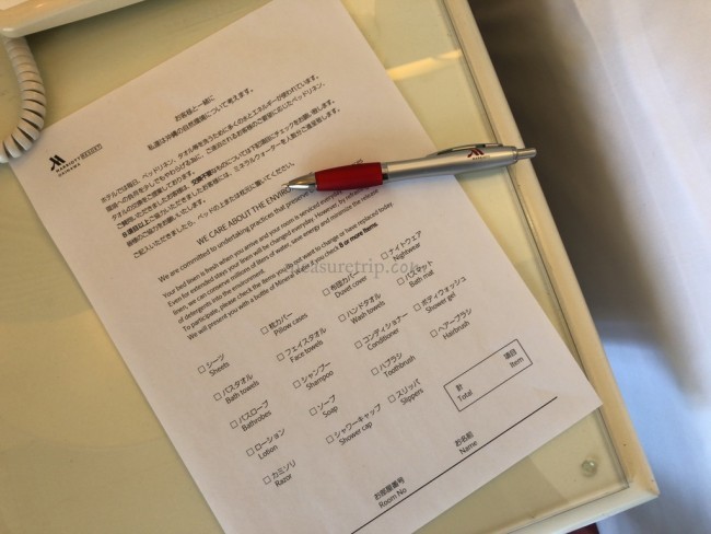シーツ交換にはエコなプログラムを用意しており、サイドテーブルに置かれた専用用紙に変更不要な項目にチェックを入れることで、このエコプログラムに貢献することができる。また、チェック項目に8項目以上チェックを入れると、宿泊人数分のミネラルウォーターも用意してくれるという特典もあったりする。