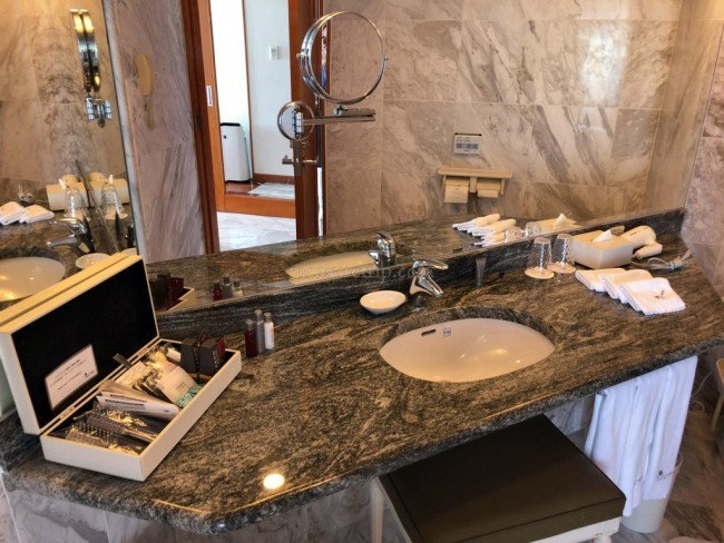 バスルーム内の洗面台は、大きな鏡が付いており、化粧用鏡ももちろん付いていて、座ってメイクできるようにイスも付いている。これは毎日化粧を欠かせない女性には非常に嬉しい設備だ。