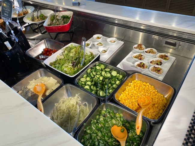 沖縄マリオットのメインダイニングでのランチビュッフェは、ガッツリ食べられる揚げ物や炒めもの料理、そしてアラカルトメニューでいただくような肉料理も用意されていて、とても美味しく食事をすることができた。利用者も朝食ビュッフェに比べて少ないので、落ち着いて食事ができるのも好ポイントだった。