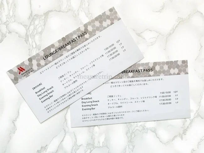 またこの琵琶湖マリオットホテルのビュッフェ朝食は、マリオット・ボンヴォイ・プラチナエリート会員以上であれば宿泊プランに関わらず、ウェルカムギフトとは別に会員特典として無料で付いてくる。その朝食特典のバウチャー(写真のもの)はラウンジ利用券と兼用となっており、こちらの券をレストラン入口で提示することで、朝食ビュッフェを利用することが出来る。