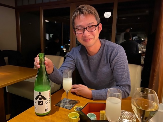 さて、この翠嵐ラグジュアリーコレクションホテル京都のシャンパンディライトで置かれている日本酒も、シャンパン同様、その時の時期により内容が異なる。最初に訪れたシャンパンディライト(春の時期)には発泡酒がおかれていたが、次に訪れた際はその発泡酒の日本酒はなくなり、写真のにごり酒が置かれていたりした。