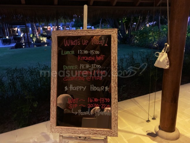 なお、バーに関しては、1杯頼むと同じメニューがもう一杯タダになるなど、ハッピーアワーも設けられていることもある。お酒代を節約したい場合は、ハッピーアワーなどのようなお得なサービスを有効活用してほしい。なお、このWモルディブのレストランスケジュールや、ハッピーアワー情報はレセプションのポップにこうして表記されているので、チェックしておこう。