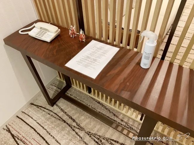 エントランス付近の簀の子風の仕切りの近くには長いカウンターテーブルが置かれ、その上には電話、除菌スプレーが用意されている。
