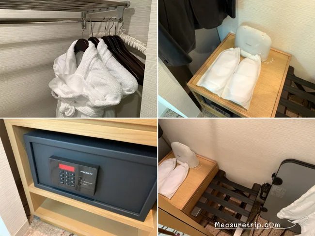 クローゼットの中にはハンガーラックとハンガー、スリッパ、アイロンとアイロン台、ラゲッジスタンド、パンツプレス、セキュリティボックスが用意されている。なお、クローゼットの中は棚収納は殆どないので、下着などは持ってきたスーツケースなどに収納することになりそうだ。
