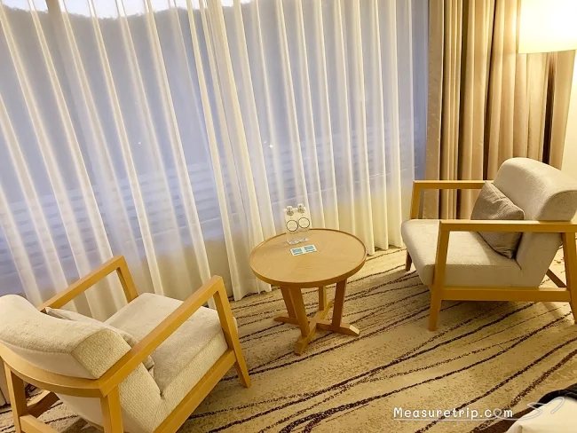 ベッドルームの窓際には一人掛けソファ×2とミニテーブル。テーブルの上には無料のミネラルウォーターも置かれている。なお、このミネラルウォーターは複数日宿泊の際にはベッドメイキングの時に補充してくれる。
