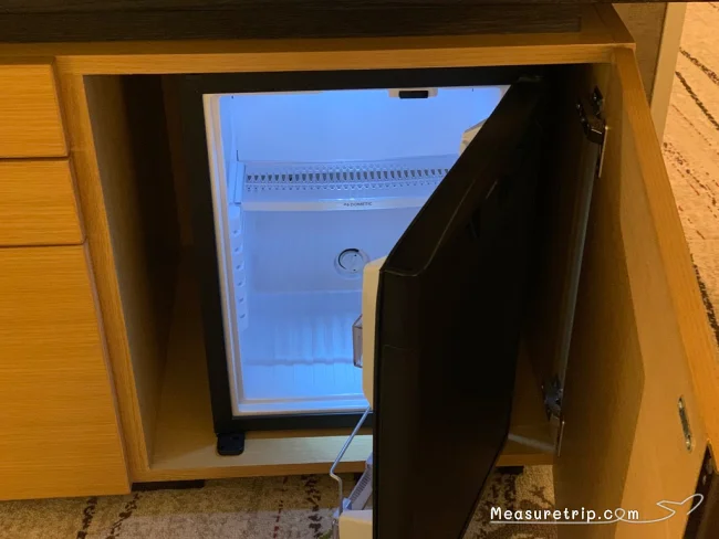 デスク下の扉を開けると空の冷蔵庫が備わる。お水や持ち込んだ飲み物はここで冷やしておこう。冷凍庫は付いていない。