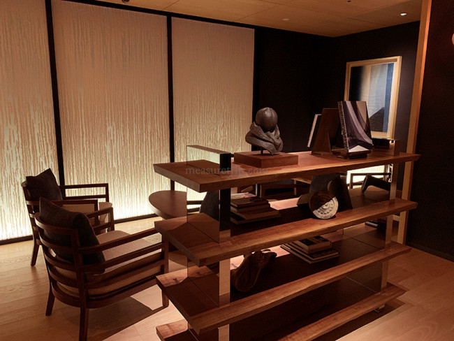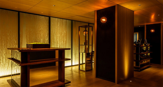 受付に向かうまでの廊下には伏見稲荷の千本鳥居をモチーフにデザインされた木製オブジェがライトに照らされ、幻想的な空間に誘われるように奥へと進んでいきます。