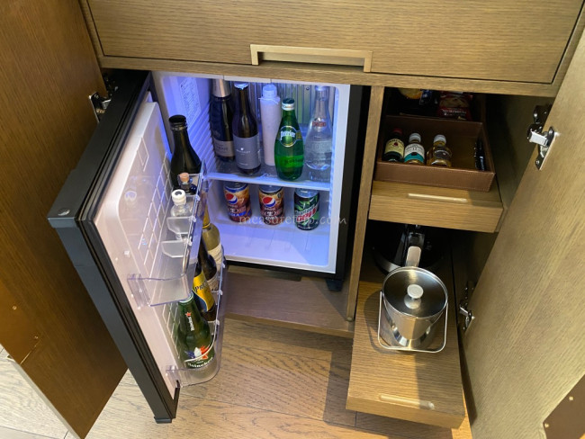 ベッドの向かい側の壁際には、冷蔵庫やミニバーなどが備わるキチネットコーナーが用意されている。