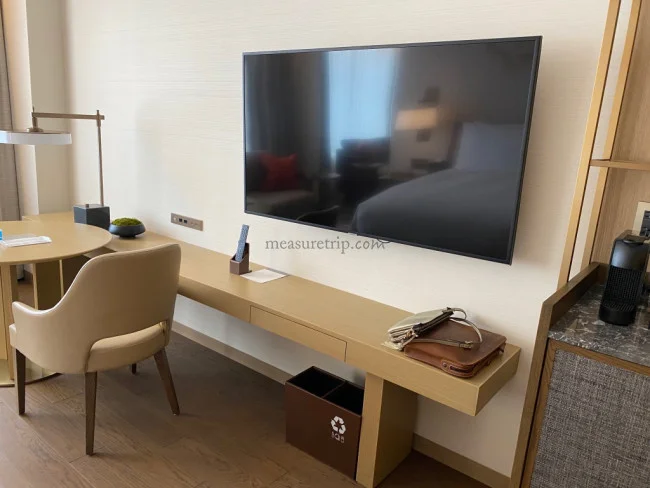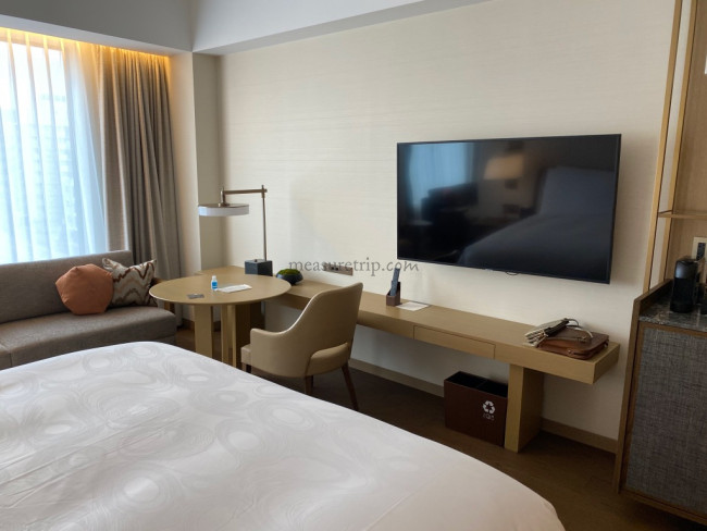 エントランスを奥に進むと、デラックスルームのメインルームがあらわれる。ワンベッドルームタイプのこのお部屋だが、広さは約36m2 と、一番スタンダードなお部屋としてはしっかりと広めの設定となっている。さすがはプレミアムクラスのJWマリオットブランドならでは。