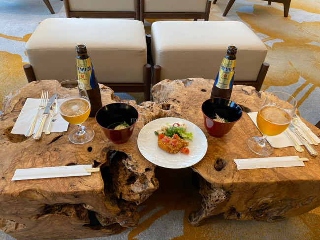 とある日のラウンジで提供されていた食事の一部がこちら。中央には美味しそうなローストビーフ、手前にはいちご大福、奥にはパスタ料理・・・と、がっつりとボリューム感のある料理と美味しそうなスイーツ。これとビールなんかで、少食なら十分お腹いっぱいになりそうな感じだ。