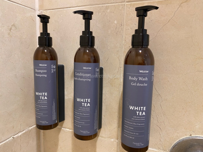 シャワールームには、備え付けのウェスティンオリジナル「ヘブンリースパ」のシャンプー、コンディショナー、ボディウォッシュが置かれている。ホワイトティーのアロマを使った、ほのかで上品な香りのアメニティとなっているので、匂いに敏感な人でも使いやすい。