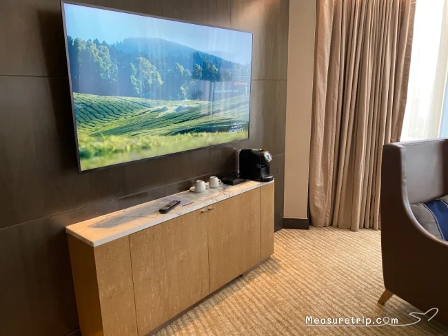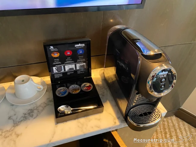 テレビの下のサイドボードには、イタリアンエスプレッソ LAVAZZA のカプセル式コーヒーメーカーが置かれている。ちなみにシンガポール マリオット タンプラザ ホテルのコーヒーは、このイタリアの老舗エスプレッソメーカーの「LAVAZZA / ラヴァッツァ」が採用されている。