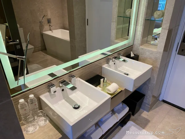 バスルームのシンクはスイートルームらしく2台備わる。シンクの横には各種バスアメニティとミネラルウォーター2本(無料)も置かれている。