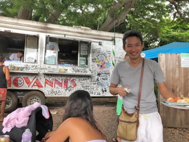 さて、このジョバンニのフードトラックであるが、見て分かる通り、トラックは全面落書きだらけになっている。そしてその埋め尽くされた落書きにミヅキも私達の名前を書いて、このジョバンニ@ハレイワでガーリックシュリンプを食べた記念の落書きを残す。そう、このガーリックシュリンプのフードトラックには、ゲストが思い思いに自分の落書きを残せるようになっているのだ。はるばる長い時間を掛けてノースショアまでやってきて、さらに長時間並んでやっと食べることが出来たジョバンニのガーリックシュリンプ。その思い出を落書きにして残しておけば、きっとそのガーリックシュリンプの思い出がより印象深くなることだろう。