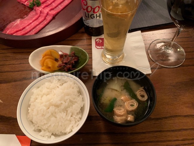 このすき焼きセットメニューには、最初のつけ添えに加え、ご飯、味噌汁、そして香の物といった、和食の定番セットもちゃんと付いてくる。本当に日本の和食店で食事をしているような、そんな安心感が漂う燦鳥(サントリー)。ハワイ・ワイキキの中にあって、この店内は日本国内そのものだ。