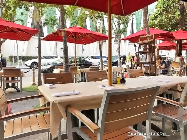このアランチーノディマーレの場所は、マリオットワイキキ ホテルの1階。入り口は、クヒオビーチ側からマリオットホテルを見た時に、向かって左側(北側)のOhua Avenue(オフア通り)に面したビーチ側。赤いパラソルがたくさん並んだオープンカフェスペースがとても目立っているのですぐにわかるはずだ。