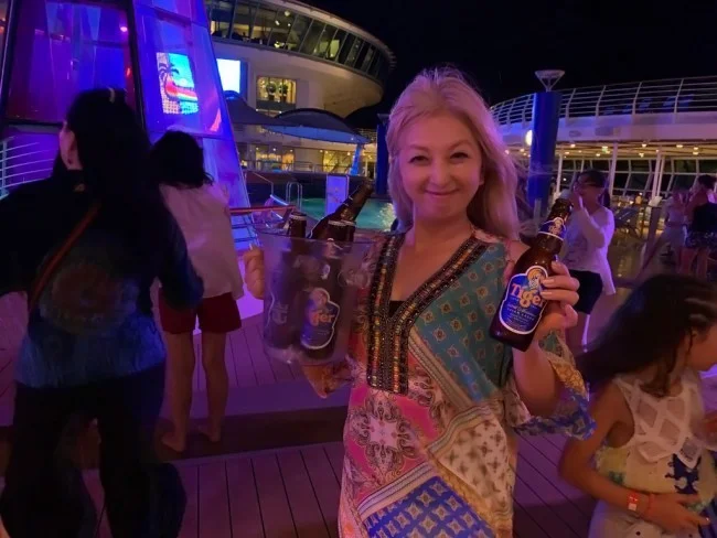 さて、私達はプールパーティーの会場にあるバーでタイガービールを注文する。シンガポールのタイガービールはライトな味わいで、私が非常に大好きなビールのひとつなんだけど、このクルーズ船では、なんとタイガービールが一番安い♪ そして、ロイヤルカリビアンのクルーズでは、同じお酒を4杯頼むと、1本無料でサービスしてくれる「BUY4 GET1」という割引サービスがある。