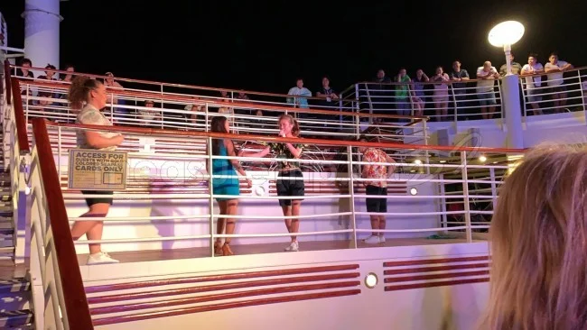 プールパーティーの場所はボイジャー・オブ・ザ・シーズのデッキ11のプールバーのある付近。時間は夜の22時30分から0時までと、結構遅いダンスパーティーではあるが、この船の子どもたちの門限は午前0時まで。というわけで、このダンス会場には、大人はもちろん、たくさんの子供達も訪れている。