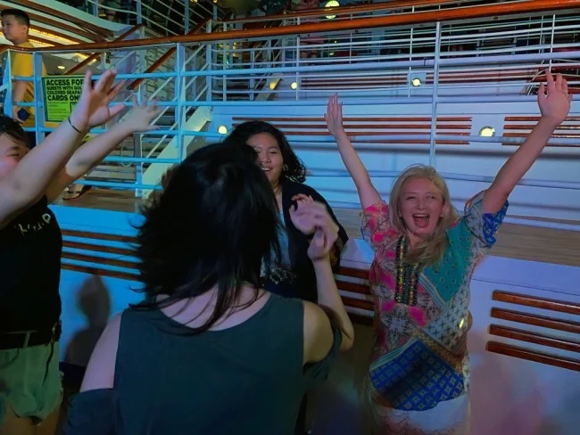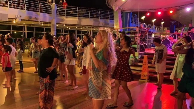 そんな華麗なフレアバーテンディングのショーが終わると、続いて始まったのは、壇上のスタッフと一緒に踊る、エキサイティングなダンスタイム!舞台の上で決まった踊りを披露し、それをダンスフロアのゲストたちが見よう見まねで真似しながら同じ動きをする。もちろん、ピッタリ同じ動きは難しく、運動音痴なミヅキは、いつもワンテンポ遅れながら体を動かす(笑)。そう、このダンスパーティーも、クルーズ船スタッフが手本になって進められていくので、ダンスが全然出来なくても全然平気♪