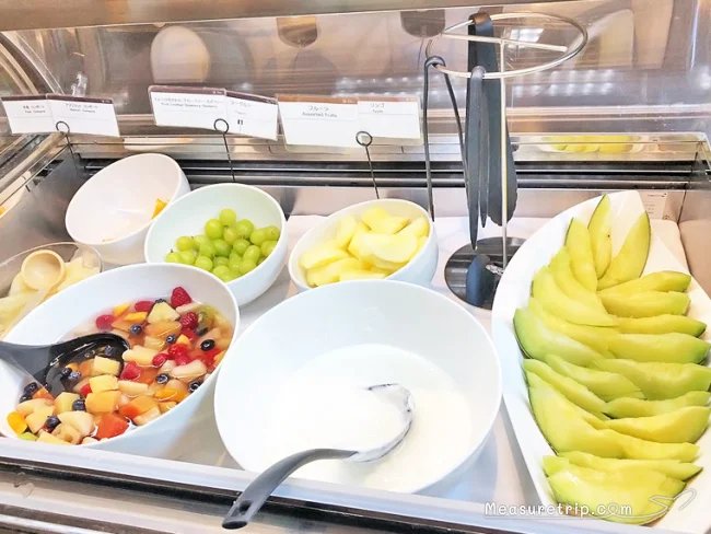 フルーツ・デザートのコーナーにはフルーツポンチや、よく熟れたメロンなど、様々なフルーツが並んでいる。中央にはヨーグルト。何でもかんでも取って食べたくなるような、美味しそうな色合いに食欲がそそられる。