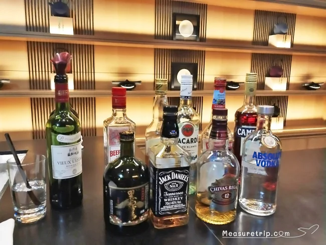 また、ラウンジ入口近くのバーカウンターでは、夕方17:00~のカクテルタイムに合わせて、スピリッツやリキュールのお酒を提供が始まり、テーブルにはバーボンや、スピリッツ、リキュールなどが並ぶ。カクテルタイムと言っても、一般的にカクテルのレシピを知っている人は少ないため、置かれているリキュールはどれも、ソーダで割ったりジュースで割ったりするだけで飲めそうなお酒が多い。