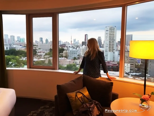 こちらが今回アップグレードで用意されていたタワーサイドコーナールーム。扇状になったお部屋の窓からは、パノラミックな東京の町の風景を眺めることができる。そして、ビルの向こうには東京タワーもしっかり見えていたりする。スゴいゴージャスな部屋だなぁ。。
