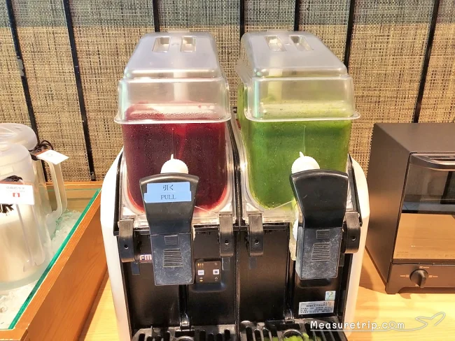 また、バーカウンターの向かいにはお茶や野菜ジュース、コーラといった炭酸類、そしてビールが冷やされている冷蔵庫もある。これはお昼前のティータイムに撮った写真だが、ビールは普通に冷やされていた。ビールに関してはいつでもいただくことが出来るのかな?