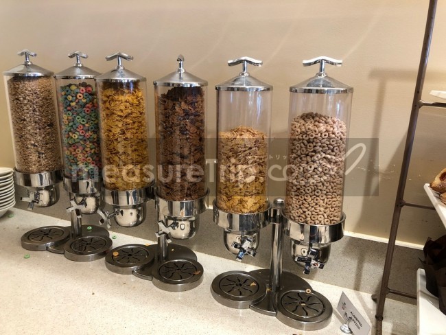 こちらはシリアルコーナー。アメリカの朝食といえばシリアル。。。というわけで、シリアルの種類もかなり豊富に準備されている。そういえば、アメリカの朝食ビュッフェでは必ずと言っていいほど置かれている、レインボーカラーのシリアル(左から2番目)。あれ、、、色的にちょっと手が出しづらいんだが、美味しいんだろうか。。。