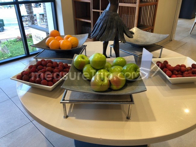 ビュッフェカウンターの端の方には、リンゴやオレンジ、ライチの丸ごとフルーツコーナーもある。