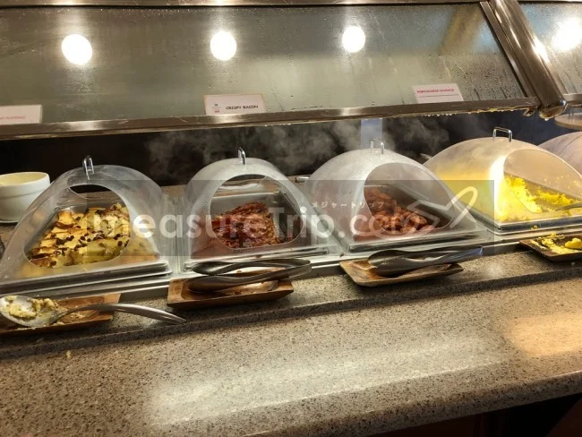 まずは、ベーコンやスクランブルエッグ、パンプディングなど、コンチネンタルブレックファストの定番メニューが並べられたコーナー。プレートの下からはモクモクとスチームが上がってきて料理を温めている。