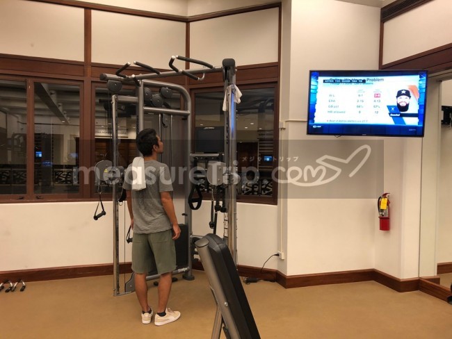 その他、このフィットネスジムには使い方がよく分からない、プロっぽいトレーニングマシーンも置かれている。使い方がぜんぜん分からず、唖然とする私。上の棒にぶら下がったりするんだろうか・・・。