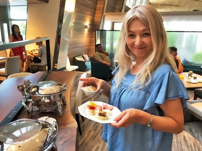 琵琶湖マリオットのラウンジで夕食。このホテルの近所は店舗が全然無いので、食事は基本、ホテル内で済ませることになる。私たちは1階のラウンジのカクテルタイムを利用して、ラウンジ飯を今日の晩ごはんにすることにした。