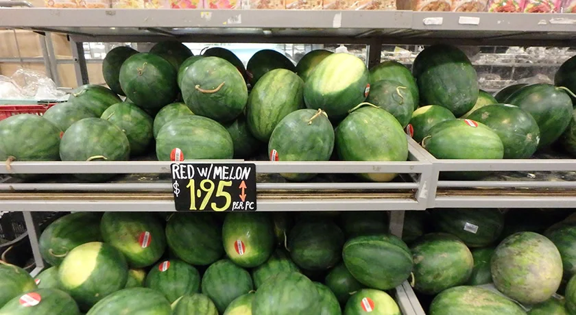 ベトナム・タンソンニャット国際航空の「国際線ターミナル」のロータスラウンジにて、乗り換えまで時間がないけど置いてあるスイカだけは食べたいミヅキ。