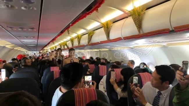 いよいよベトジェットエアの初就航便の機内へと搭乗だ。機内に入るとまずは可愛らしいユニフォームのCAさんがお出迎えしてくれる。今回のフライトは日本 - ハノイの初就航というだけに、日本人のCAさんもちゃんと乗っている。