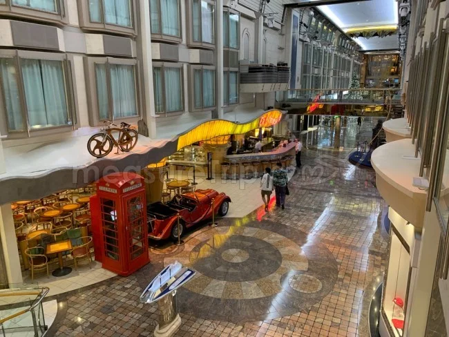 ロイヤルカリビアンのクルーズ船「ボイジャー・オブ・ザ・シーズ」のクルーズ旅行。夜のクルーズ船内を歩く。お店は閉まっているところも多いが、メインストリートのプロムナードではまだまだ沢山の人が行き来していたりしていて楽しい。