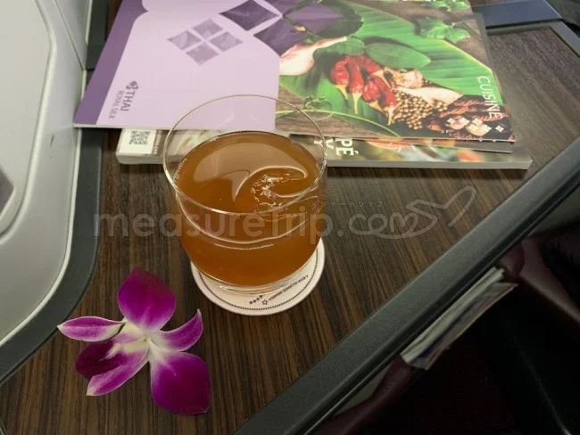 タイ国際航空 A350-900 ビジネスクラスの機内の様子。ミヅキは最後まで張り切ってシャンパン(ヴーヴ・クリコ)を飲んでたが、私はどうもこのシャンパンに弱いらしく、ちょっと今回はソフトドリンクをいただくことにしよう・・・。